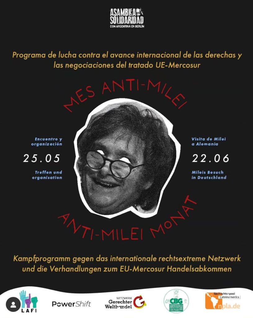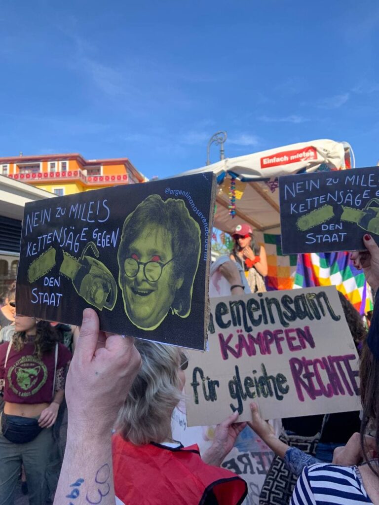 Desarrollar estrategias de lucha y resistencia en contra del gobierno de Milei, entendiendo a éste como laboratorio de las nuevas derechas en el mundo, desde nuestro lugar como migrantes en Alemania. Nuestra acción estará orientada a la disputa ideológica y política de las narrativas liberales, antipopulares, represivas, autoritarias, racistas, xenófobas, antiambientalistas, lgbtiq-odiantes, sexistas y/o discriminatorias de y acerca de este gobierno, a partir del desarrollo de contenido y de acciones concretas.